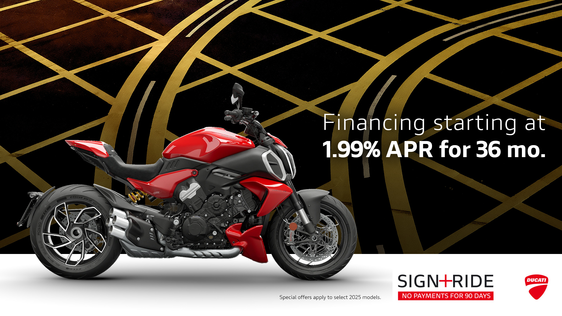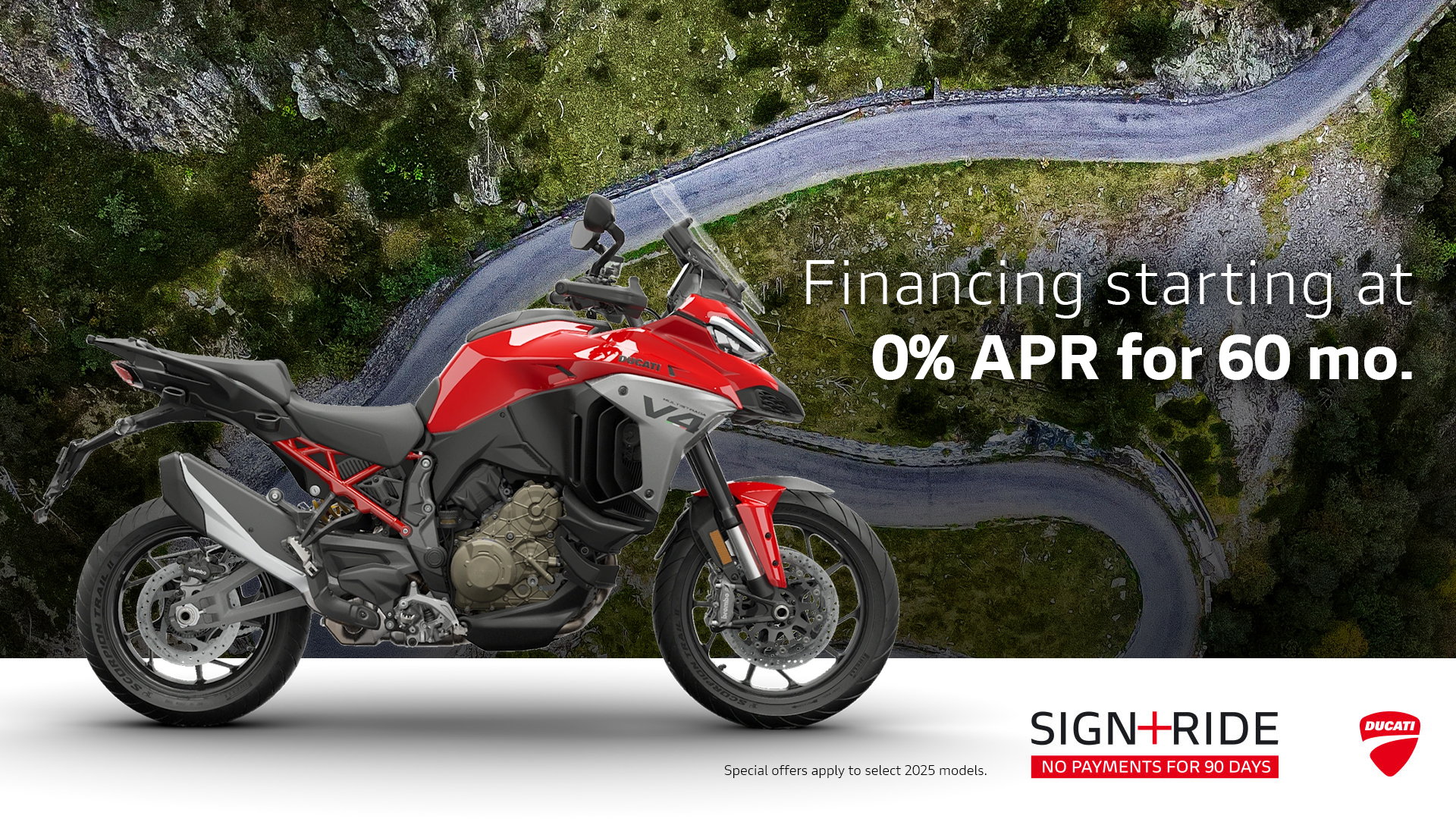 Offer available on select 2025 models to highly qualified customers on approved credit by Ducati Financial Services through participating and authorized Ducati dealers from January 6 - 31, 2026. Down payment requirement varies from 0%-25% of the purchase price based on credit worthiness. Not all customers will qualify for the advertised APR. Minimum amount financed is $5,000. See your local Ducati dealer for financing details or, for general product information, call 1-888-391-5446. VW Credit, Inc. dba Ducati Financial Services is a servicer for VCI Loan Services, LLC. © 2025 Ducati North America.