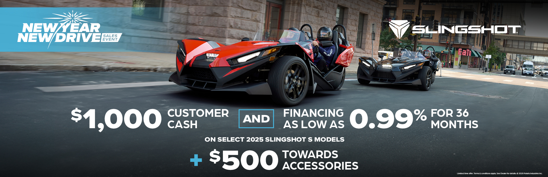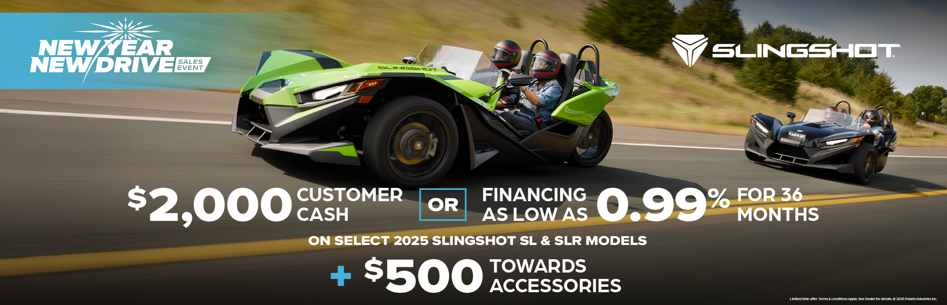 RESTRICTIONS: VALID FROM FEBRUARY 1 – MARCH 8, 2026, WITH THE PURCHASE OF AN UNREGISTERED 2024, 2025 OR 2026 NEW SLINGSHOT RECEIVE UP TO $500 (IN LOCAL CURRENCY - USD OR CAD) ON QUALIFYING SLINGSHOT PARTS, ACCESSORIES, CLOTHING & GEAR. COUPON CODE MUST BE PRESENT AT THE TIME OF PURCHASE. DISCOUNT IS APPLIED AFTER APPLICABLE TAX, SHIPPING AND HANDLING FEES ARE ADDED. APPLICABLE TAX, SHIPPING AND HANDLING FEES DO NOT QUALIFY FOR DISCOUNT AND ARE THE RESPONSIBILITY OF THE PURCHASING CONSUMER. OFFER IS VALID IN-STORE ONLY AT AUTHORIZED SLINGSHOT DEALERSHIPS IN CANADA AND THE UNITED STATES. ONLY ONE COUPON MAY BE REDEEMED ON A SINGLE UNIT PURCHASE. OFFER MAY NOT BE COMBINED WITH OTHER WITH OTHER PARTS, SERVICE, GARMENTS & ACCESSORIES (“PG&A”), DISCOUNTS, OFFERS OR PROMOTIONS. WHILE SUPPLIES LAST. OFFER HAS NO CASH VALUE AND CANNOT BE APPLIED TO PAST TRANSACTIONS. CONDITIONS AND RESTRICTIONS APPLY. FOR COMPLETE DETAILS ON THIS OFFER, VISIT SLINGSHOT.POLARIS.COM/EN-US/SPECIAL-OFFERS/